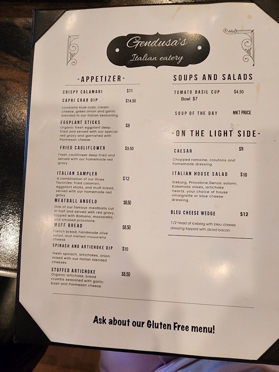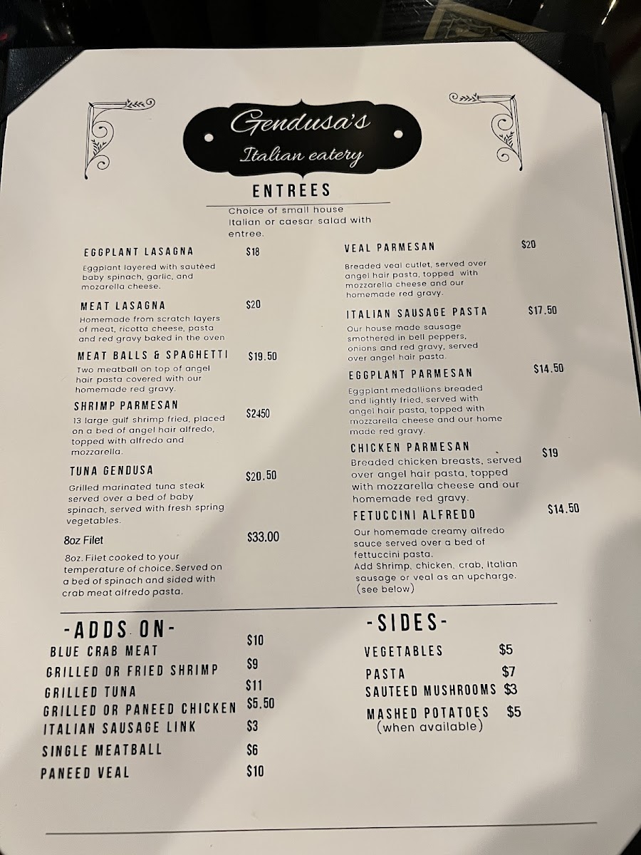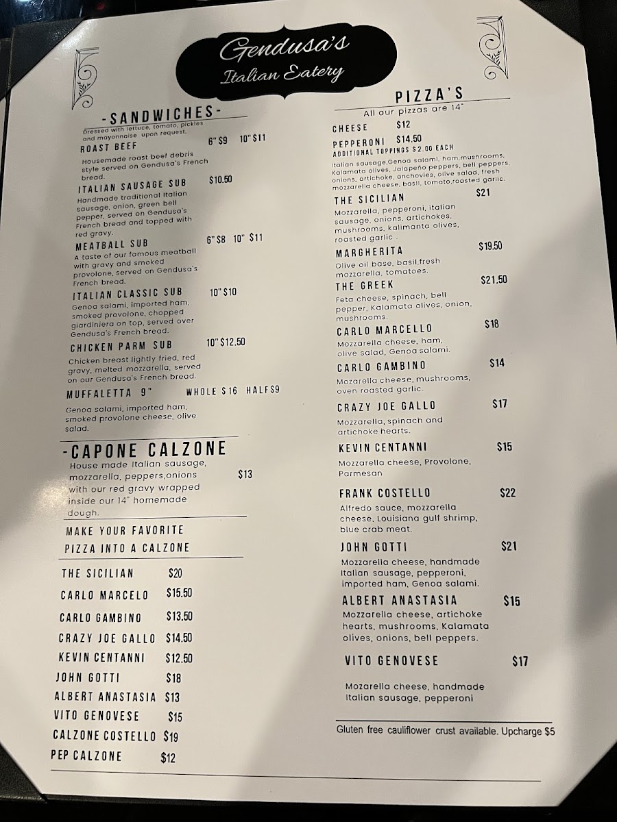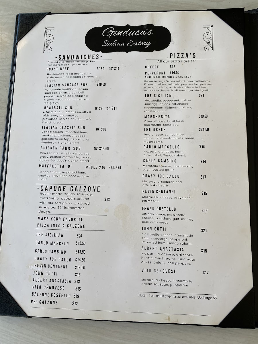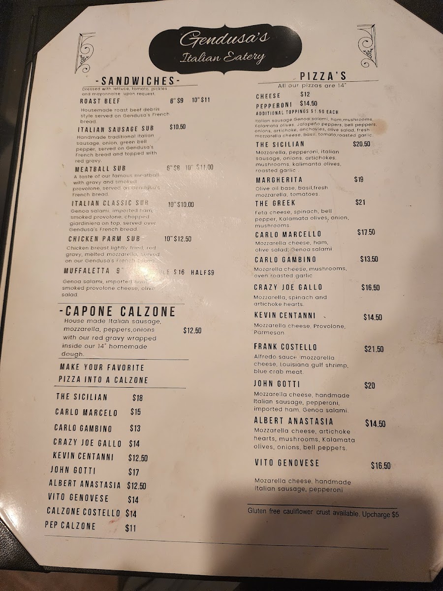 Welcome to Gendusa's Italian Eatery Menu, where the heart of Italy meets the warmth of Kenner. Whether you’re in the mood for a hearty pasta, a classic pizza, or something a little different, their menu has something for everyone. With fresh ingredients and timeless recipes, you can expect every dish to deliver on both flavor and comfort. From their signature lasagna to their flavorful seafood options, every bite feels like a step into a true Italian kitchen. Don’t forget to explore their range of mouthwatering appetizers and sides, perfect for sharing or enjoying on your own. Whether you’re here for a quick lunch or a cozy dinner with family, the menu offers a delightful selection that’s sure to satisfy your cravings.