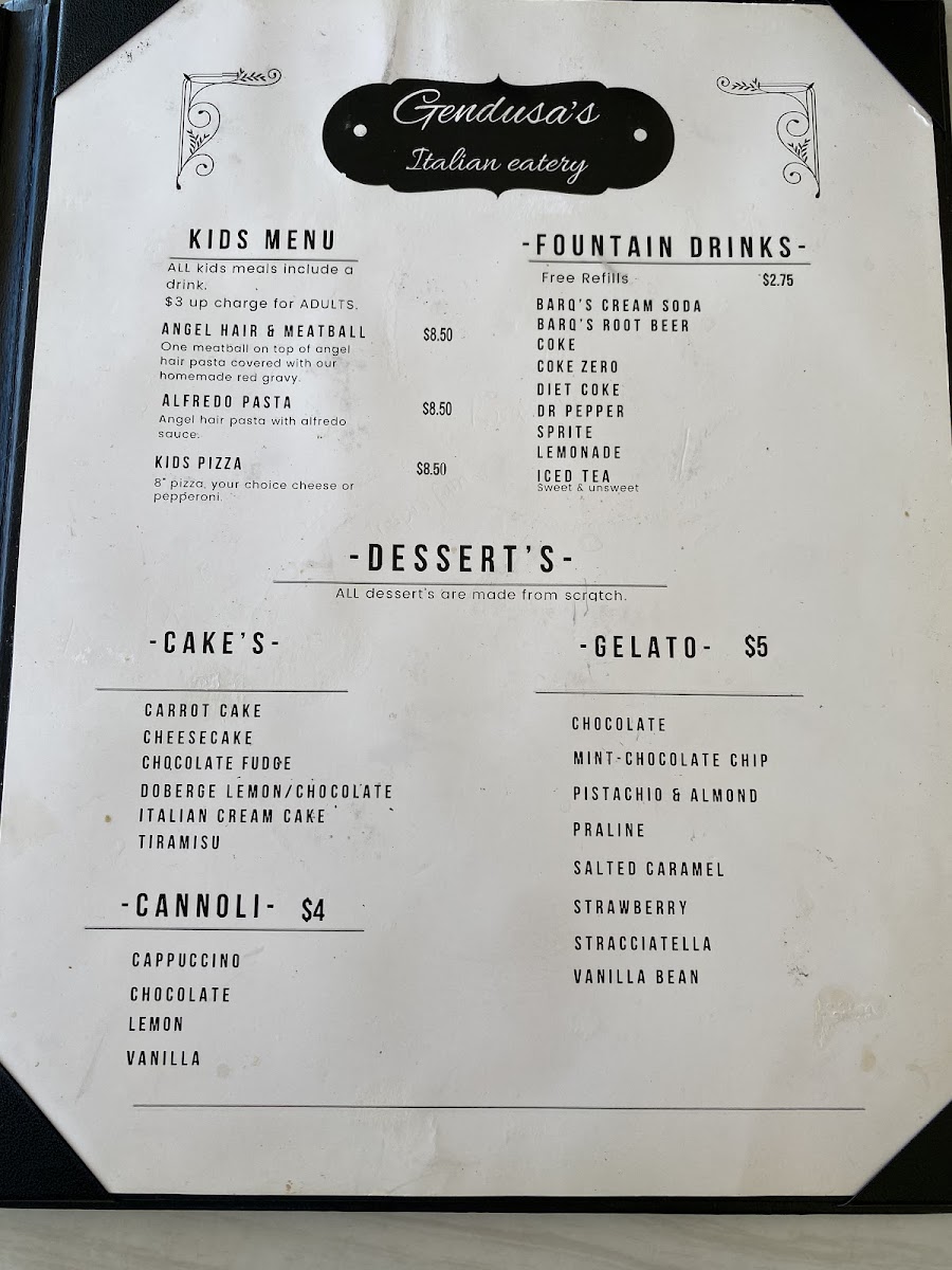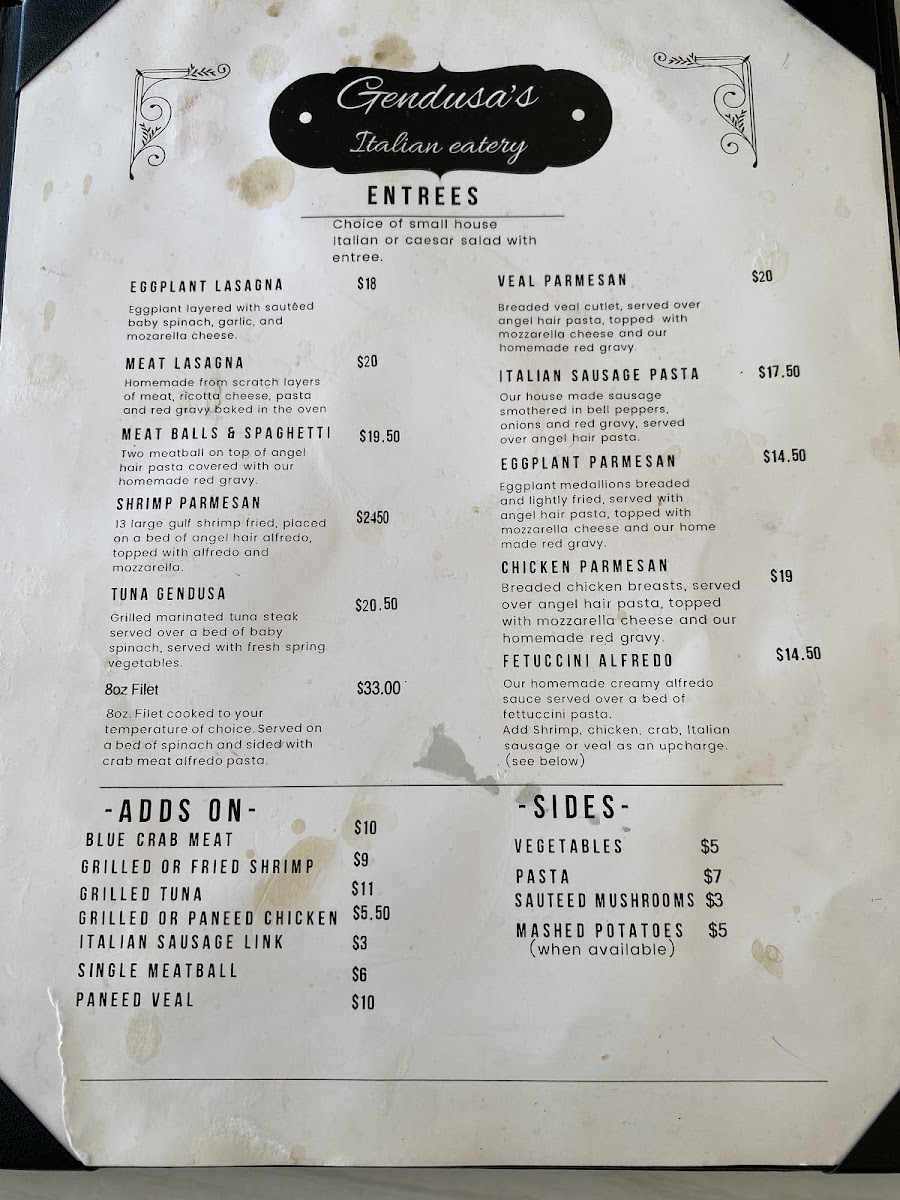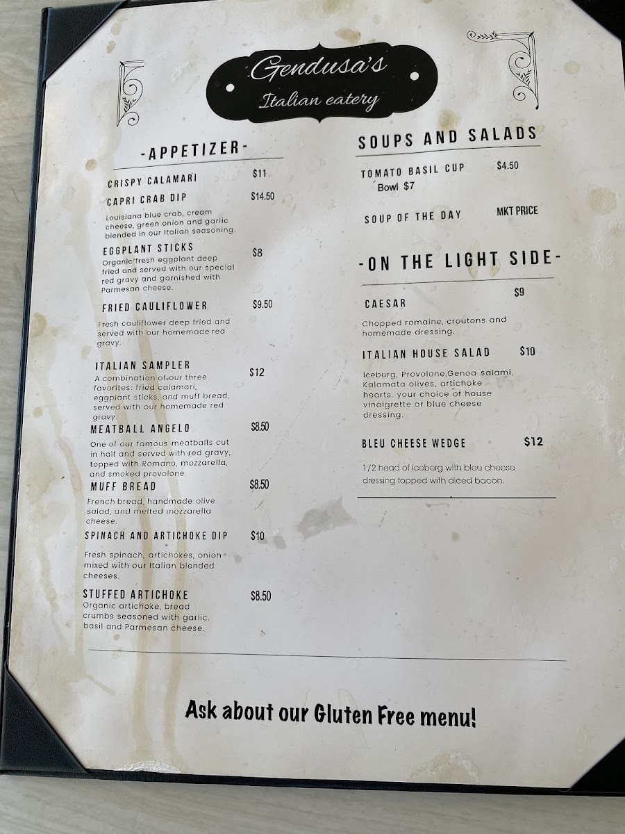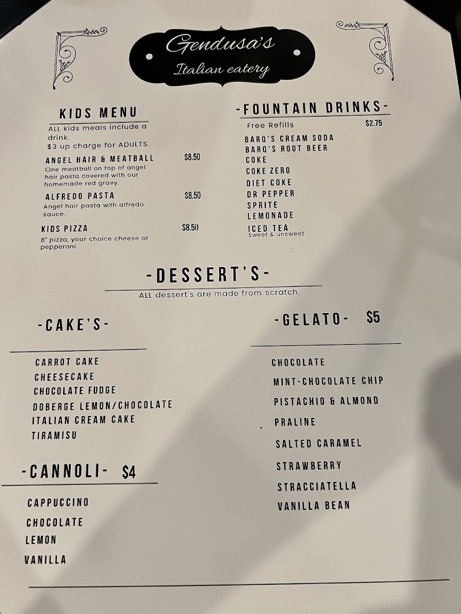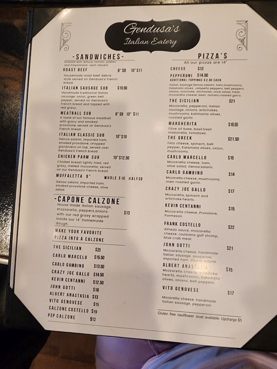 Welcome to Gendusa's Italian Eatery Menu, where the heart of Italy meets the warmth of Kenner. Whether you’re in the mood for a hearty pasta, a classic pizza, or something a little different, their menu has something for everyone. With fresh ingredients and timeless recipes, you can expect every dish to deliver on both flavor and comfort. From their signature lasagna to their flavorful seafood options, every bite feels like a step into a true Italian kitchen. Don’t forget to explore their range of mouthwatering appetizers and sides, perfect for sharing or enjoying on your own. Whether you’re here for a quick lunch or a cozy dinner with family, the menu offers a delightful selection that’s sure to satisfy your cravings.